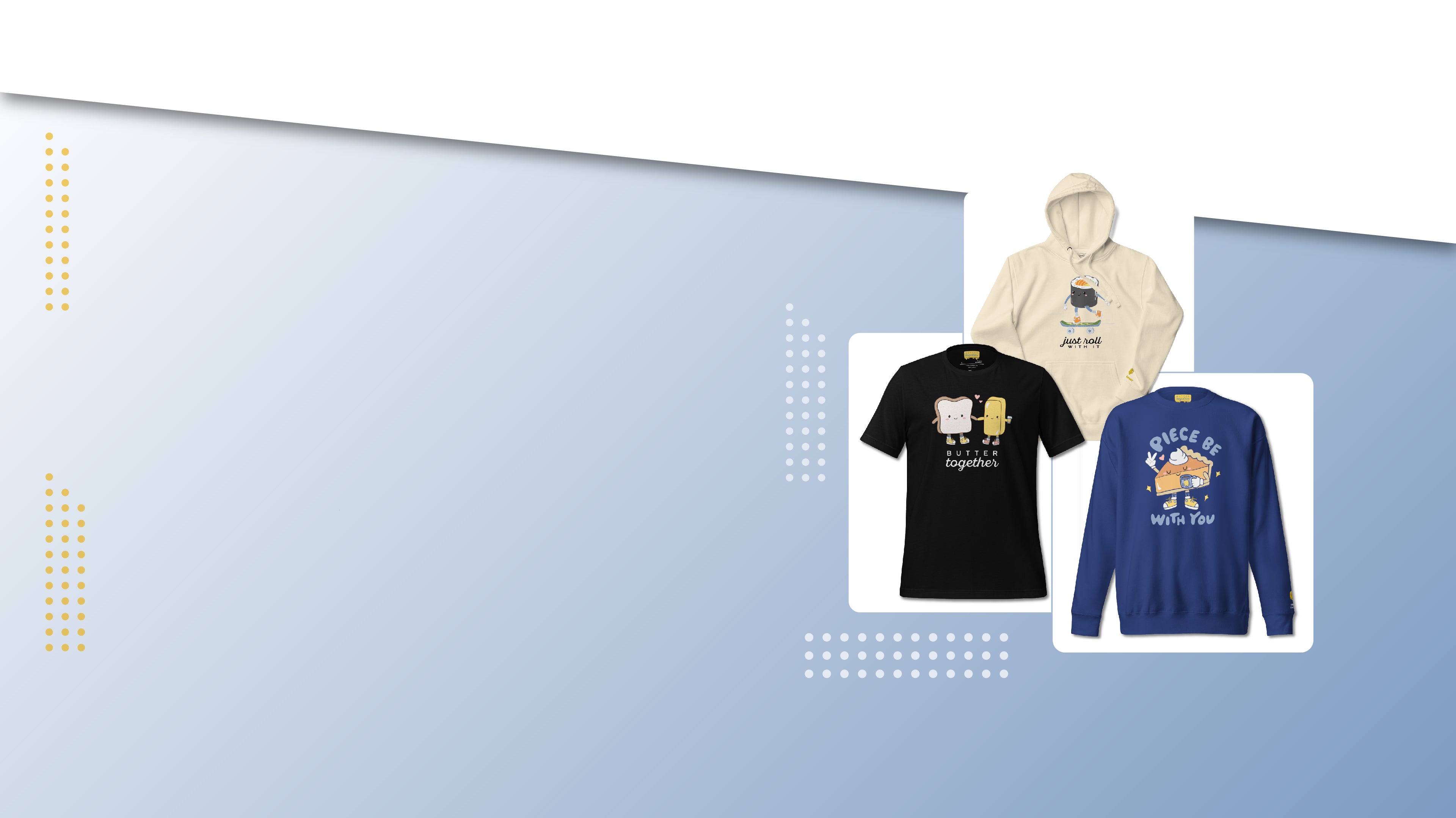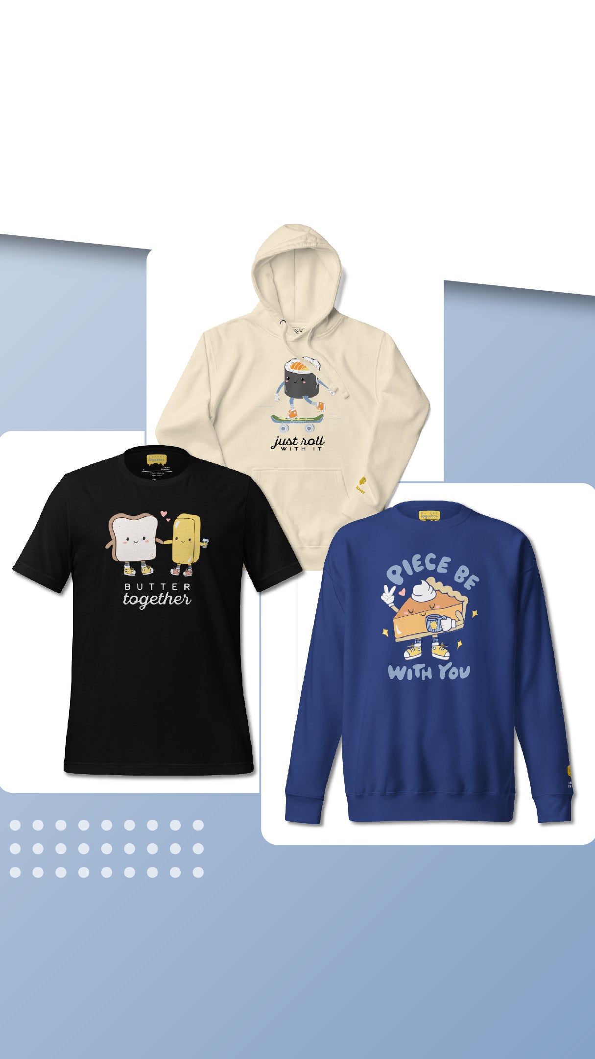 As creators of a YouTube channel with a steady following over the years, we always wanted merch that nodded at our world, but was bigger than us... something that could stand alone as its own brand. For Julie, as a trained chef and former fashion designer, creating a food-inspired clothing line totally made sense. Paired with Joe's graphic design skills, we quickly realized that we were better together. We're all about spreading joy through food puns and cute quirky fun, so we focus on printed cozy comforts, or whimsical wearables created to make you smile. Food brings people together and we believe in the power of community. So wear what you eat proudly and let's be taste buds!